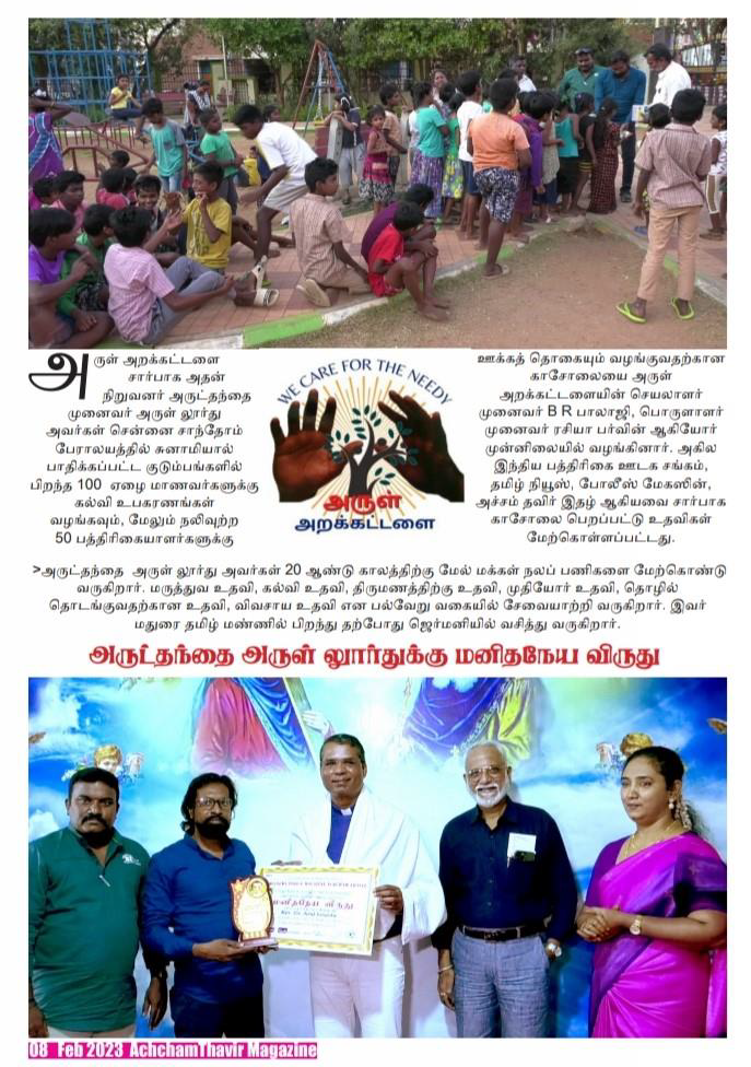 Dr. Balajee Ramachandran (Hindu), Prof. Dr. Raziya Parvin (Muslim) and Dr. Arul Lourdu (Christian) – have the foundation “Arul Arakkattalai” (Endowment of Grace) founded in Madurai, South India. Arul Arakkattalai aims to rebuild the human dignity of the poor and help to create a safer environment through the provision of support and encouragement. It aims to work for the needy people and help to improve their living and social conditions, through rights-based and ethically sound education, empowerment programmes, protection and financial independence initiatives thereby helping them to recognize their importance and value as a responsible individual within civil society.